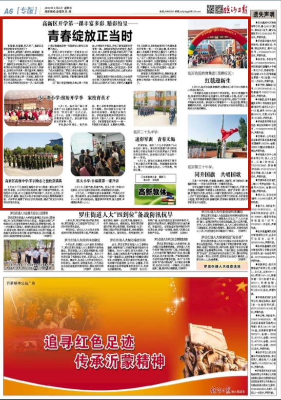 沉寂了一个暑假的学校又热闹起来了,高新区各学校敞开大门,以阳光、整洁、有序的校风校貌迎接返校学生和入学新生,各学校的开学第一课丰富多彩、精彩纷呈。临沂罗西小学向五星红旗致敬,马厂湖小学家校共育从第一天做起,高级中学军训开启励志之旅……“很有仪式感,是孩子小学生活特别有纪念的一天。”临沂龙腾小学红毯铺地迎接一年级新生让新生父母赞不绝口。
