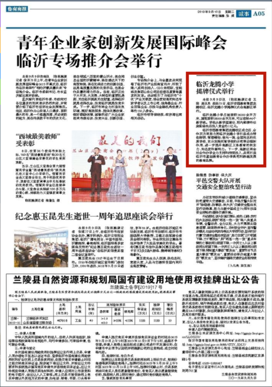9日,临沂杏园教育集团龙腾校区、临沂龙腾小学揭牌仪式在高新区举行。