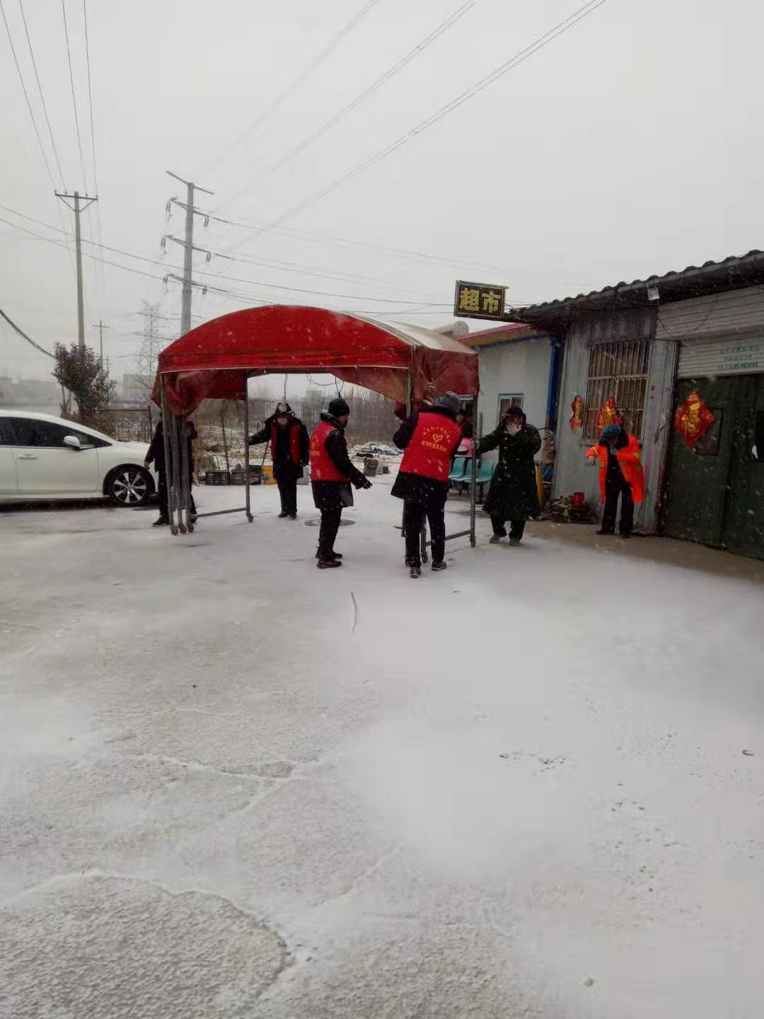 2月6日,天降瑞雪。路边的松柏在雪中岿然不动,显得格外精神,同样精神的还有马厂湖镇杭头村检查点执勤的志愿者们。一大早,杭头村的志愿者们便开始了防疫检查、执勤的工作,风雪簌簌而下,不一会便落满了一身。
