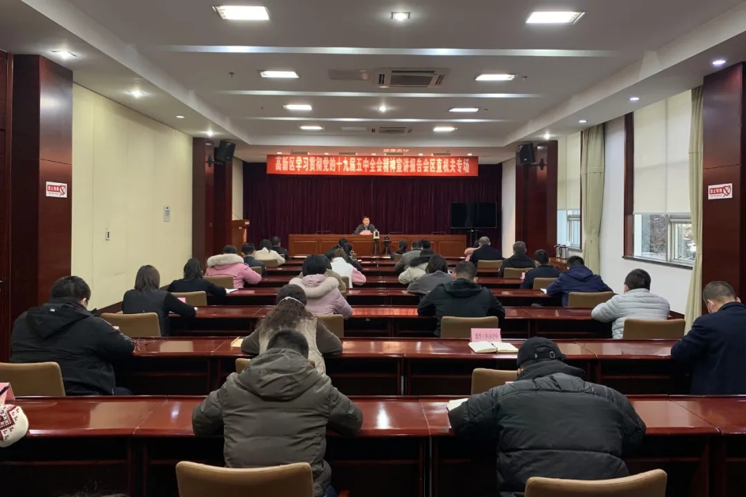 12月25日下午,高新区学习贯彻党的十九届五中全会精神宣讲报告会机关专场举行,区党工委讲师团成员,区党政办公室副主任、党工委全面深化改革领导小组办公室专职副主任涂佃伟进行宣讲,区直各部门、市属各分局,各产业发展服务中心代表参加。