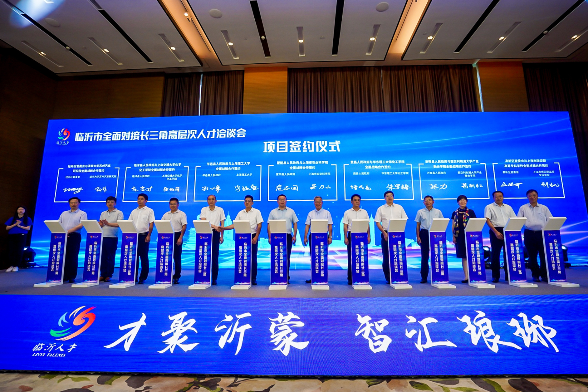 在临沂市全面对接长三角高层次人才洽谈会上,高新区管委会与上海出版印刷高等专科学校就全面战略合作进行签约,龙湖软件园与东南大学信息学院教授、博士生导师李春国就创业项目落地进行签约,临沂市海纳电子有限公司与长三角重点院校就共建研发平台进行签约。