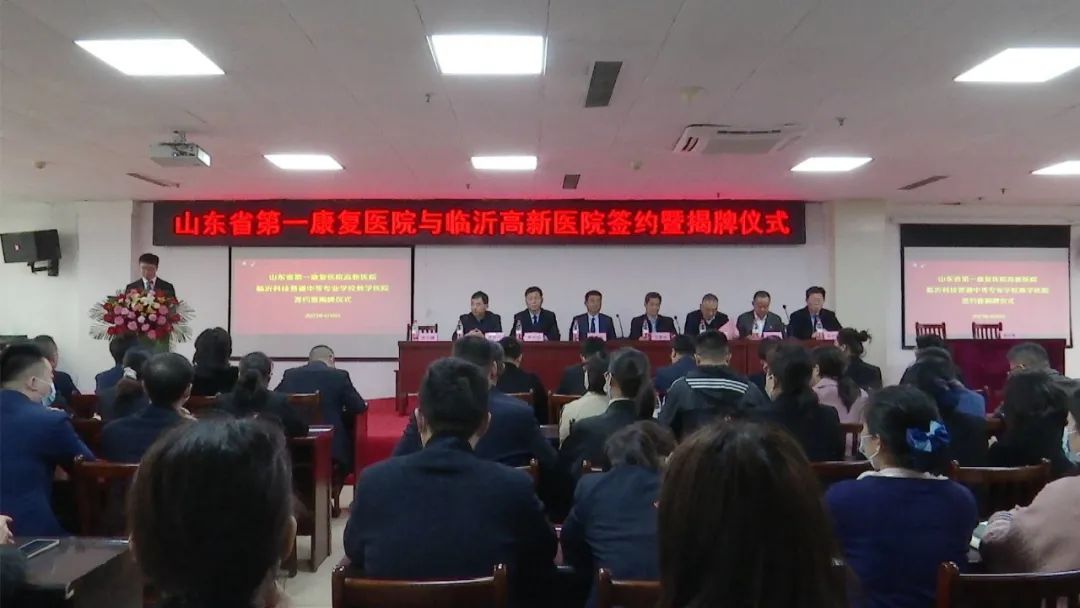 仪式上,临沂高新医院分别与山东省第一康复医院、临沂科技普通中等专业学校签署合作协议,李丕宝、王家兴共同为山东省第一康复医院高新医院和临沂科技普通中等专业学校教学医院揭牌。