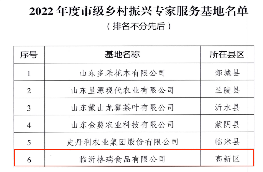 近日,市人社局公布了2022年度临沂市市级专家服务基地和乡村振兴专家服务基地名单,高新区的龙湾电子信息产业园入选市级专家服务基地,临沂格瑞食品有限公司入选市级乡村振兴专家服务基地。