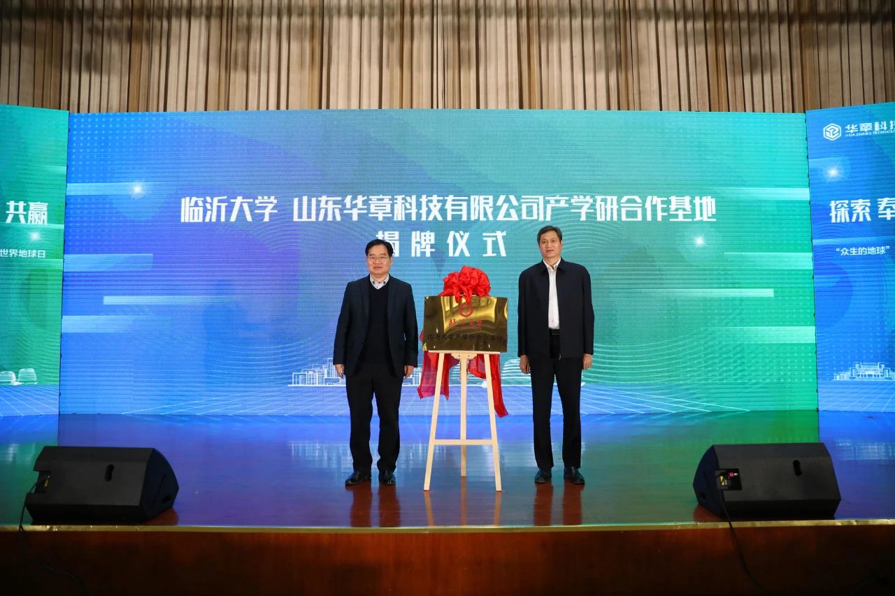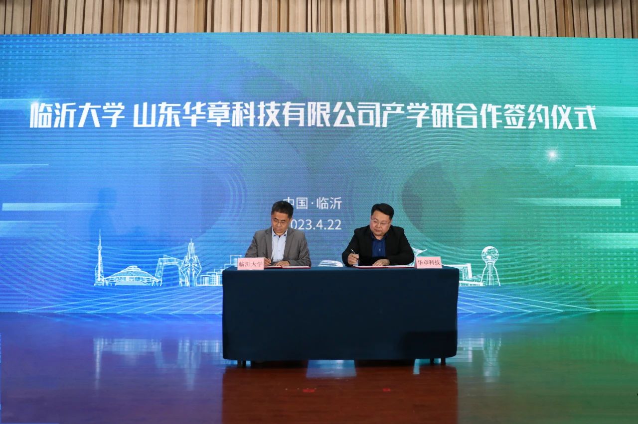 仪式上,临沂大学与山东华章科技有限公司签订了产学研合作协议,与会领导为“临沂大学产学研合作基地”揭牌。