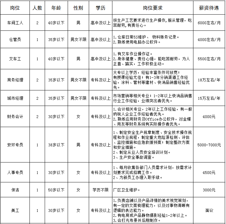 福利待遇:五险一金、节假日福利、工龄补贴、午餐补助、提供住宿。
