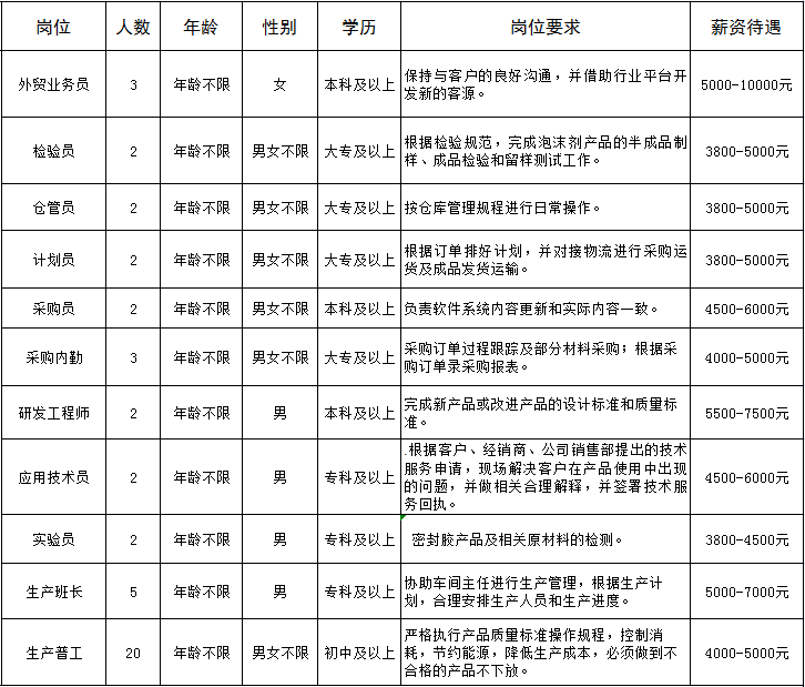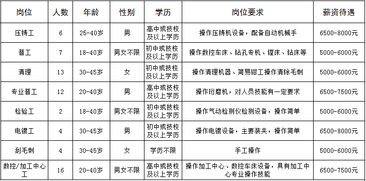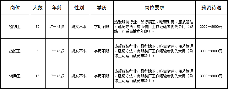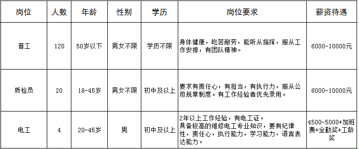 福利待遇:长白班,提供住宿,有内部食堂每月伙食补贴180元,满勤奖300元,工龄每年50元递增,按规定办理社会保险。