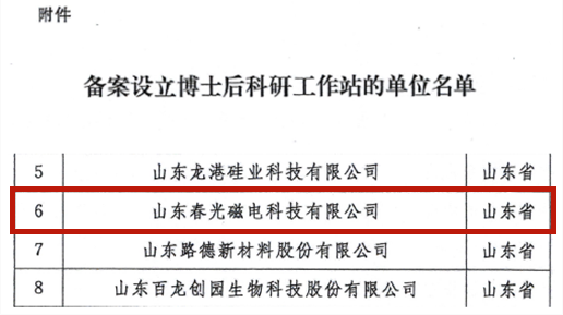 近日,全国博士后管委会办公室公布了2022年度第一批次博士后科研工作站新设站备案名单,高新区的山东春光磁电科技有限公司备案设立国家博士后科研工作站,全市2家。