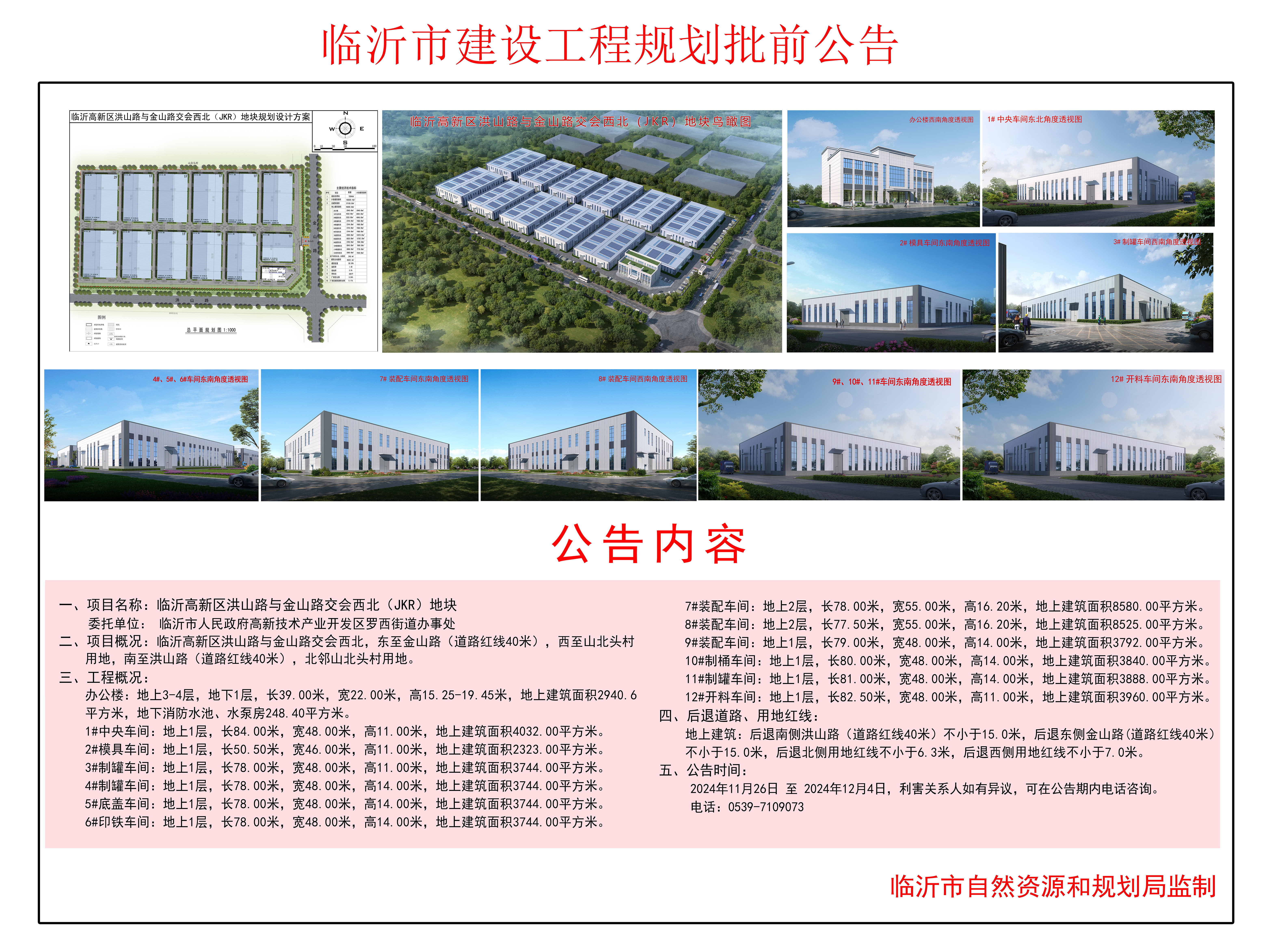 临沂高新区洪山路与金山路交会西北(JKR)地块:办公楼,1#中央车间,2#模具车间,3#、4#制罐车间,5#底盖车间,6#印铁车间,7#、8#、9#装配车间,10#制桶车间,11#制罐车间,12#开料车间建设工程规划批前公告